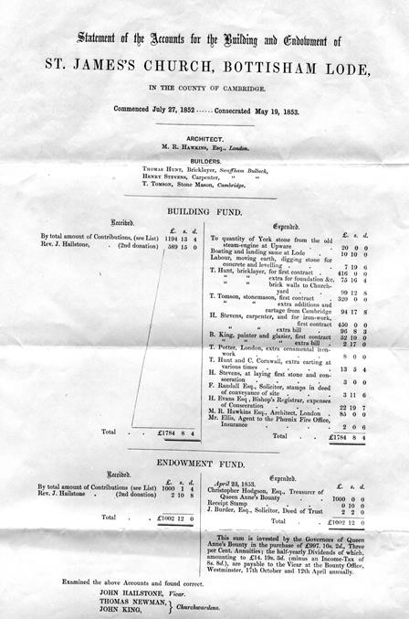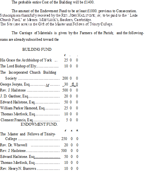 Hailstone campaigned vigorously to achieve his wish and a public subscription raised £1,700, half of which was donated by Hailstone himself; an Endowment Fund raised a further £1,000. Trinity College, Cambridge, patron of the living at Bottisham, gave the site of one acre of land, and farmers of the surrounding locality weighed in with the carriage of materials which amounted to the value of over £100.